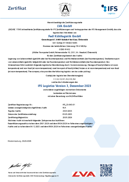 - 2018 Erste Zertifizierung der Fedl Kühllogistik GmbH nach IFS-Storage and Distribution
